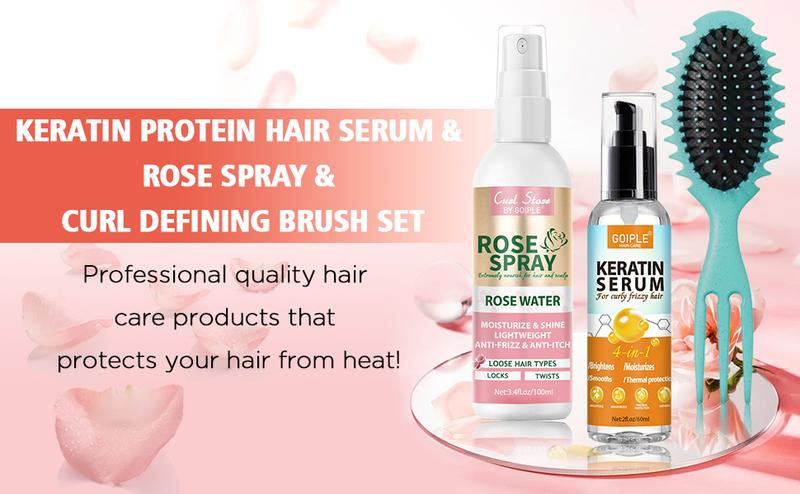 - 【Perfer Hair Care Product Set】Our Keratin oil water spray set included 1 count 3.4fl oz keratin protein hair serum + 1 count 3.4fl oz rose water + 1 count curl definging brush. Fully equipped with tools!